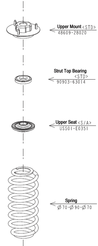 An upside-down strut top bearing can cause noise and obstruct steering, and in the long run result in damage to itself and the upper spring seat. During installation, please pay special attention to which way the strut top bearing originally faces, and replace it the same way on top of the TEIN upper spring seat (Diagram). The vehicle’s original upper mount goes on top, and the securing top nut must be tightened at the prescribed torque.