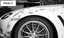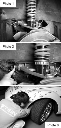 The relatively complicated multilink and double wishbone systems are becoming more common, because of their active and precise control of alignment changes during driving. When installing new shock absorbers or low down springs, you usually jack or lift up the car and temporarily detach the upper arm (Photo 1) from the vehicle body. Now when reattaching it at the end, if you tighten its bolt (Photo 2) while still in the air, its rubber bush will twist. The strain blocks the ride height drop, back at ground level. In the worst case, the bushes can become damaged.