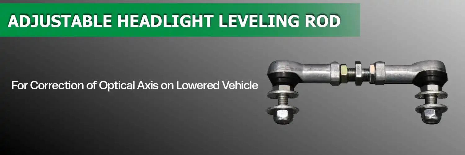 When the ride height is lowered, many of models with self-leveling headlights falsely recognize that only the rear side is lowered (the car is tilted backwards), since the sensor is only attached to the rear end. This causes the headlight axis to be automatically adjusted downward, only to light the near side as a result. With this Adjustable Headlight Leveling Rod installed, the angle of headlight level sensor is corrected close to that of OE, and hence the headlight is kept at appropriate angle.