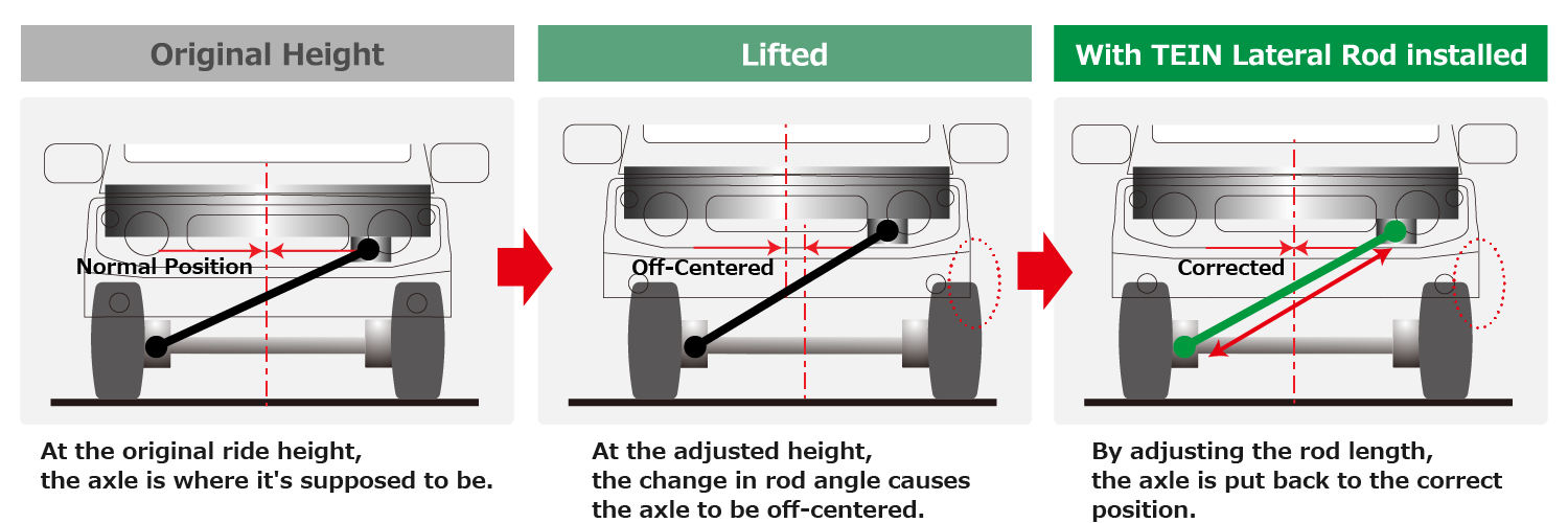 Vehicles with beam-axle suspension system are equipped with the lateral (Panhard) rod to connect the axle to the car body/chassis, preventing lateral movement. Under such suspension system, the axle is shifted sideways when the vehicle’s ride height is altered(lifted). Lateral displacement of the axle can affect the vehicle’s straight-moving behavior and cause the wheel on one side to protrude past the fender. In such case, the shifted axle position needs to be corrected by changing/adjusting the lateral rod length.
