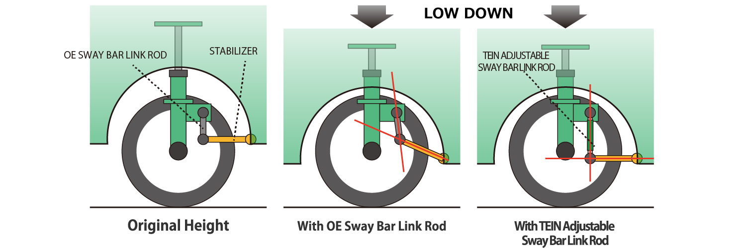 Adjustable link rods allow you to adjust the stabilizer angle which is altered when the carʼs ride height is lowered or lifted. Fine & precise adjustment in millimeters for optimum angle. Easy installation – simple replacement of OE parts.