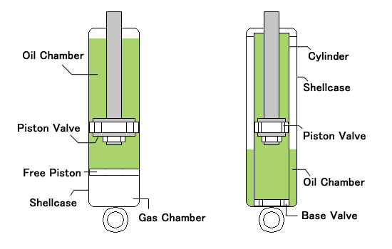 • Mono-tube: the shell case itself works as a cylinder and oil, gas, piston valve, etc are all set inside that single tube.