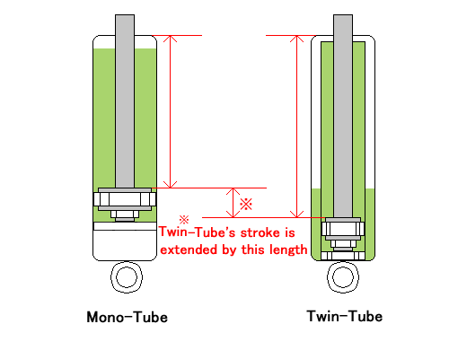 As oil and gas chambers are divided and positioned serially inside the mono-tube, it is harder to ensure the sufficient stroke compared to the twin-tube of the same length.