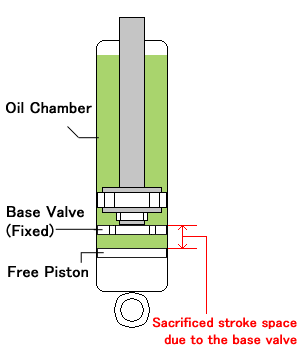 Some manufacturers have the base valve positioned above the free piston to lower the gas pressure, but this results in even further sacrifice in stroke and has an adverse effect on ride quality.