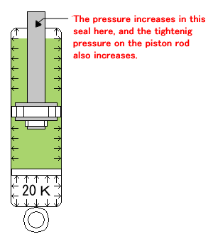 When the gas chamber is filled with high-pressure gas, there will be an equal amount of pressure exerted inside the shock absorber, as the effects of Pascal’s Law. In such state, there will be a high pressure applied to the oil seal, which will lead to increase in restraining force on the seal and friction.