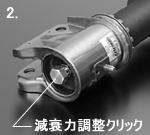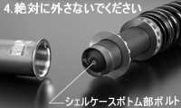 また同じMONO FLEXでも、SAタイプの場合は正立式になり、減衰力の調整をピストンロッドトップ部で行います。【写真3】EDFCの取付けもピストンロッドトップにある減衰力調整クリックノブを外して行いますので、誤ってシェルケースボトム部のボルトを外さないよう気を付けてください。この部分を外しますとインサートトップボルト同様、内部のガスが抜けてしまい、内部の部品が飛び出しケガをする場合も考えられ大変危険です。【写真4】