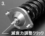 MONO FLEXのストラットタイプは、倒立式を採用しておりますので、減衰力の調整をダンパーのボトム部で行います。EDFCの取付けもダンパーボトム部にある減衰力調整クリックノブを外して行ってください。【写真2】