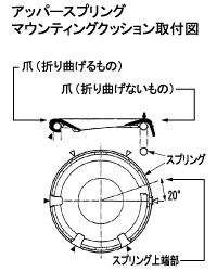 まず、アッパースプリングマウンティングクッションをスプリングに組み合わせます。その際、スプリング上端部の位置は図を参考にしてください。次に、6箇所のうち3箇所の爪(図の▼印)をスプリングに完全に巻きつけて下さい。また、残りの3箇所の爪(図の▽印)については、スプリングが縮んだ際に線間へ噛みこまぬ様、真下に伸ばしたままではなく、やや外側に広げて装着するのがベストです。ただし、あまり広げすぎると車体に干渉してしまう場合があるのでご注意ください。 【図参照】