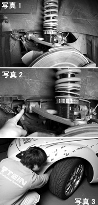 これを行う事により、仮締めした状態で、車両を地面に下ろす事で、ゴムブッシュに不要なねじれが発生することなく、設定した通りの車高となります。これは主にマルチリンク、ダブルウィッシュボーン系の車両において発生しやすい症状ですが、サスペンションの形状に関係なく、ショックアブソーバまたはローダウンスプリングを装着された場合は、必ず1G状態で各アームのボルトを締め付けて頂けますよう、お願い致します。なお、アームにピロボールが使用されている場合はこの限りではありません。