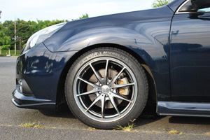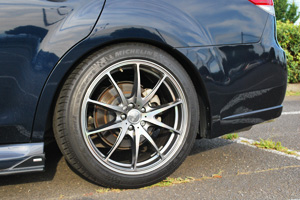 肝心の車高は、メーカー推奨値にてセットアップフロントで指一本入るぐらい、リアで少しフェンダーがかぶるぐらい。フロントはSTIのスポイラーがついていますが、地面から14cmクリアランスあります。